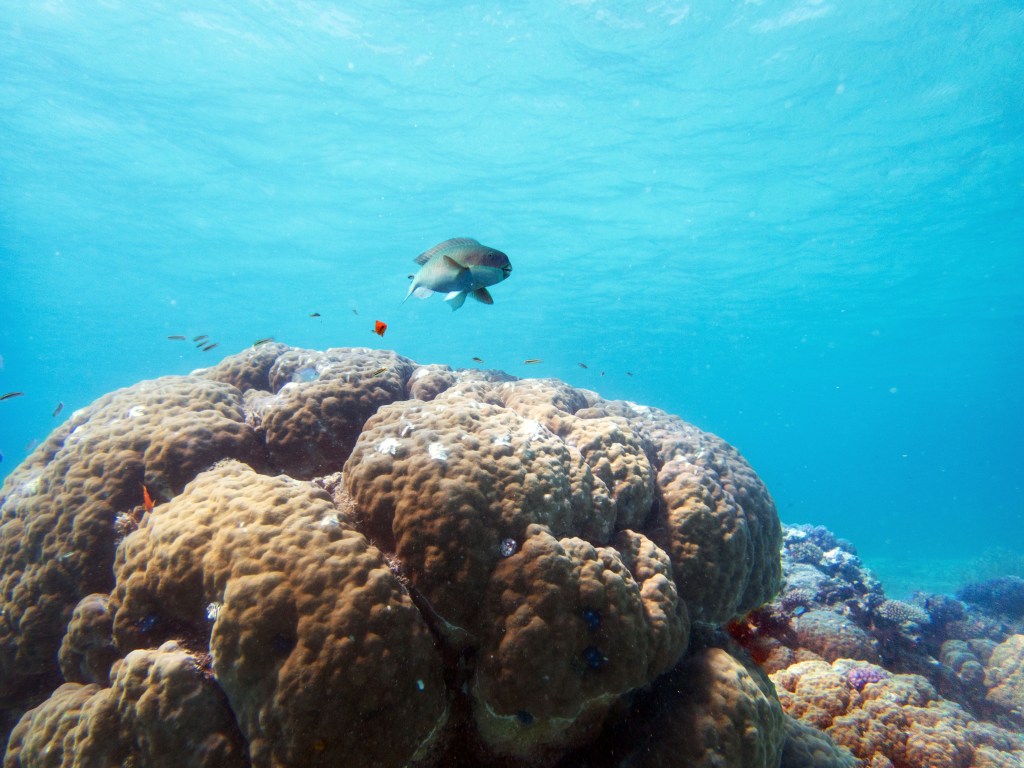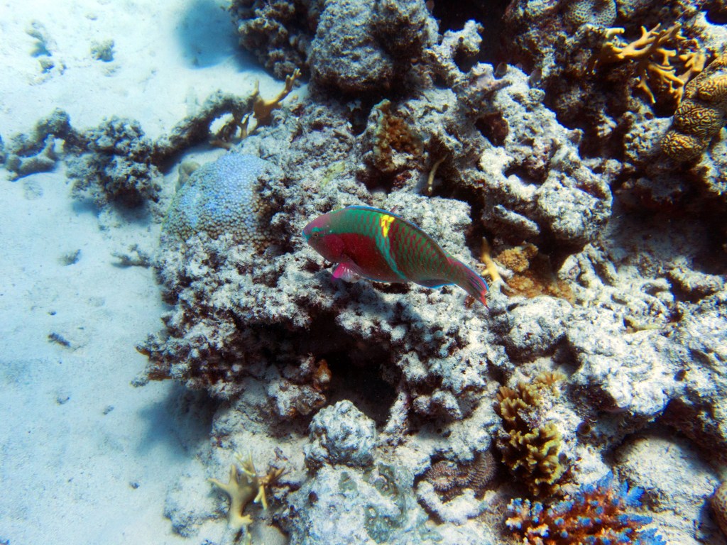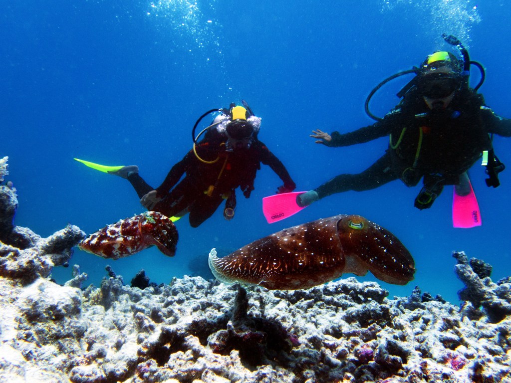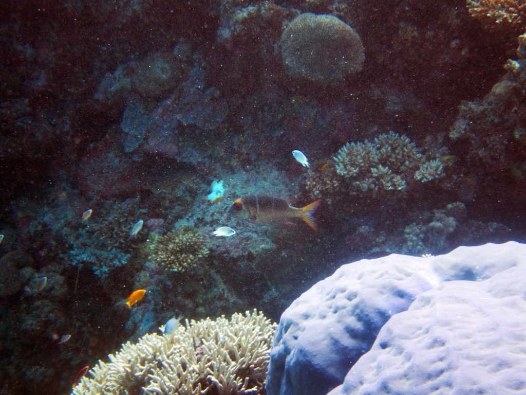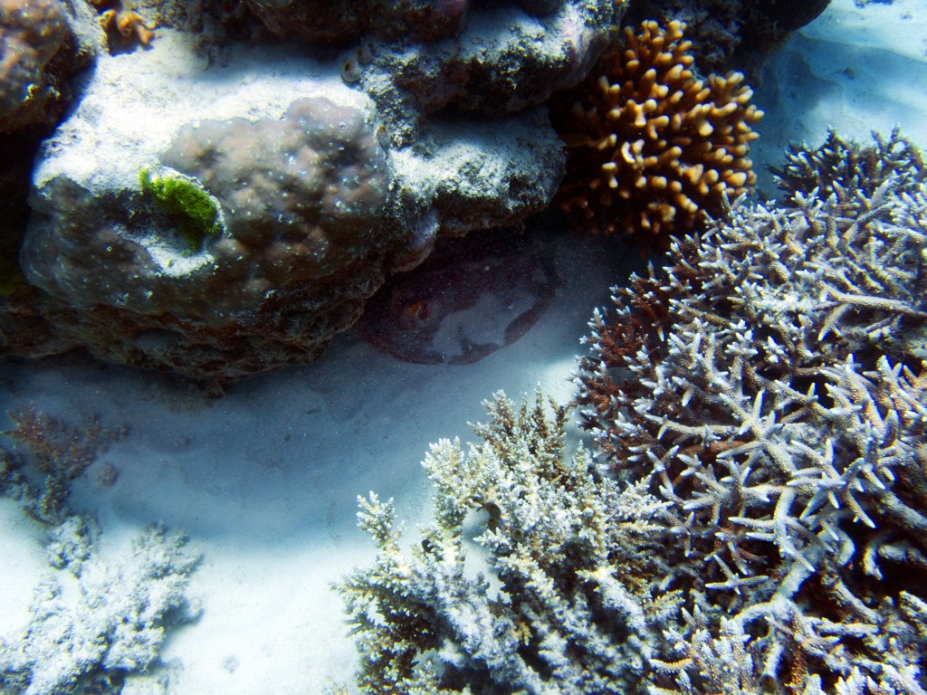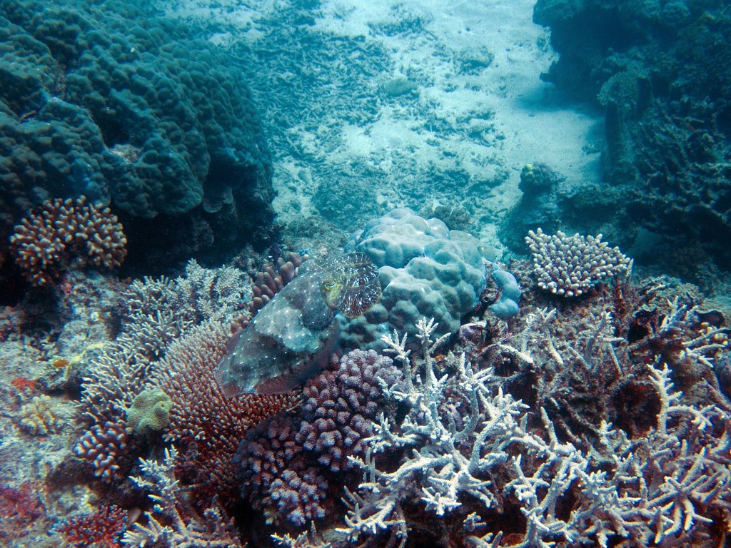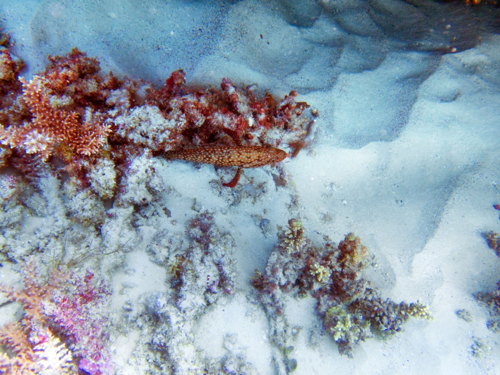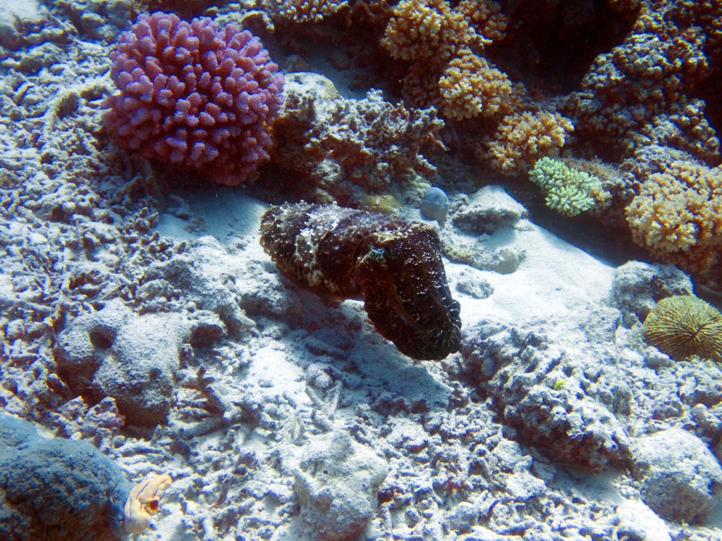 Deux seiches se reposent paisiblement vers un groupe de coraux. J’en profite pour donner l’appareil photo à notre guide afin qu’il nous prenne en photo. Nous apercevons également nos premiers Dory !!! Plus petit que ce que l’on pouvait penser, mais ceux-ci peuvent tout de même atteindre 30cm. Malheureusement pas de tortue cette fois-ci.