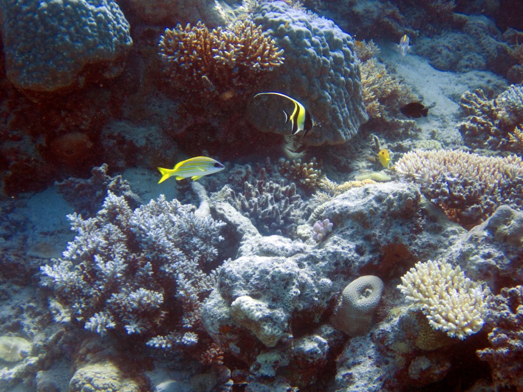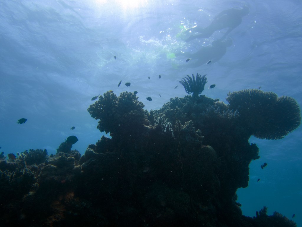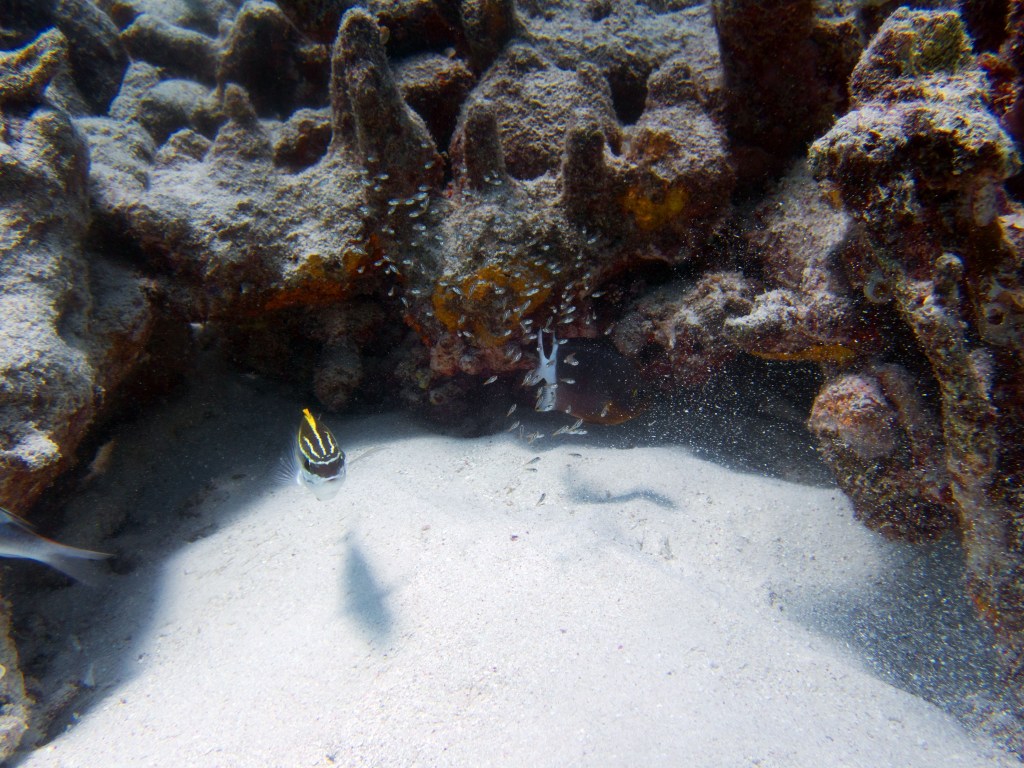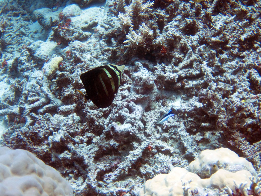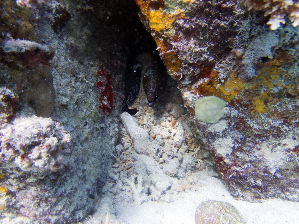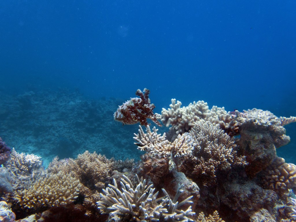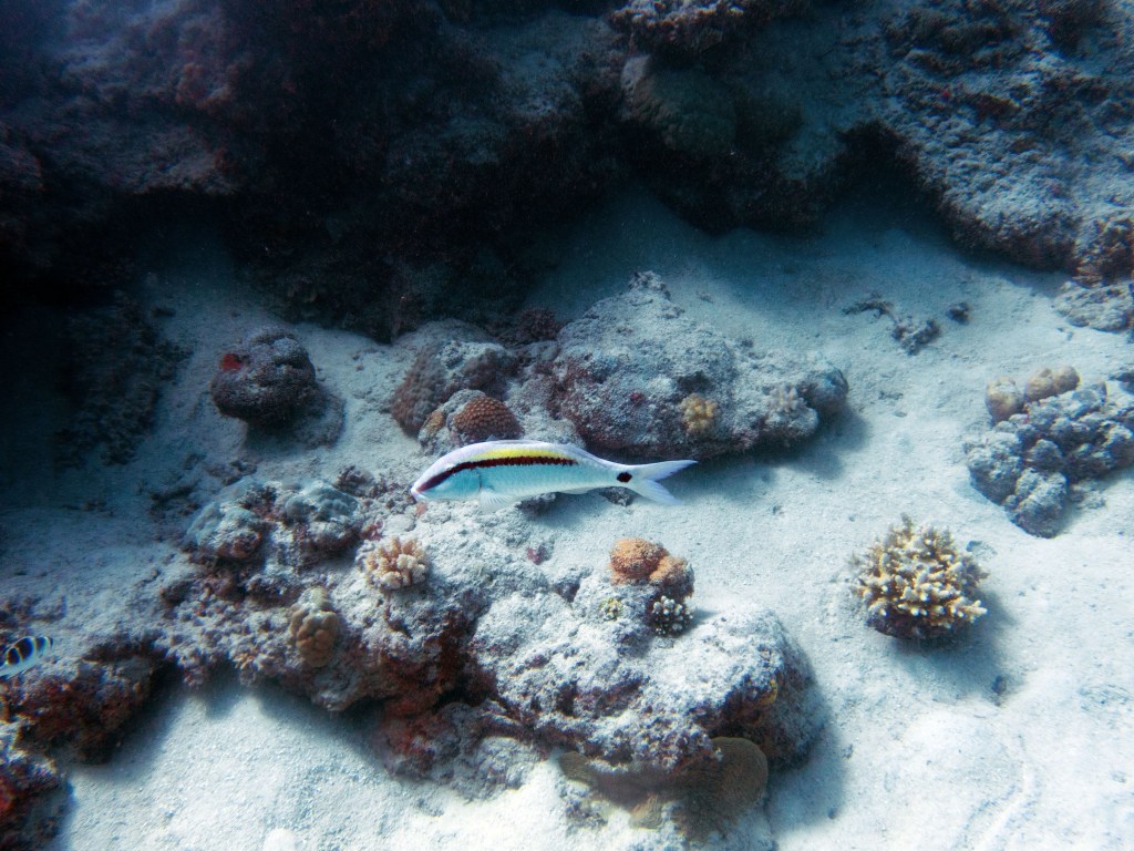 Deux seiches se reposent paisiblement vers un groupe de coraux. J’en profite pour donner l’appareil photo à notre guide afin qu’il nous prenne en photo. Nous apercevons également nos premiers Dory !!! Plus petit que ce que l’on pouvait penser, mais ceux-ci peuvent tout de même atteindre 30cm. Malheureusement pas de tortue cette fois-ci.