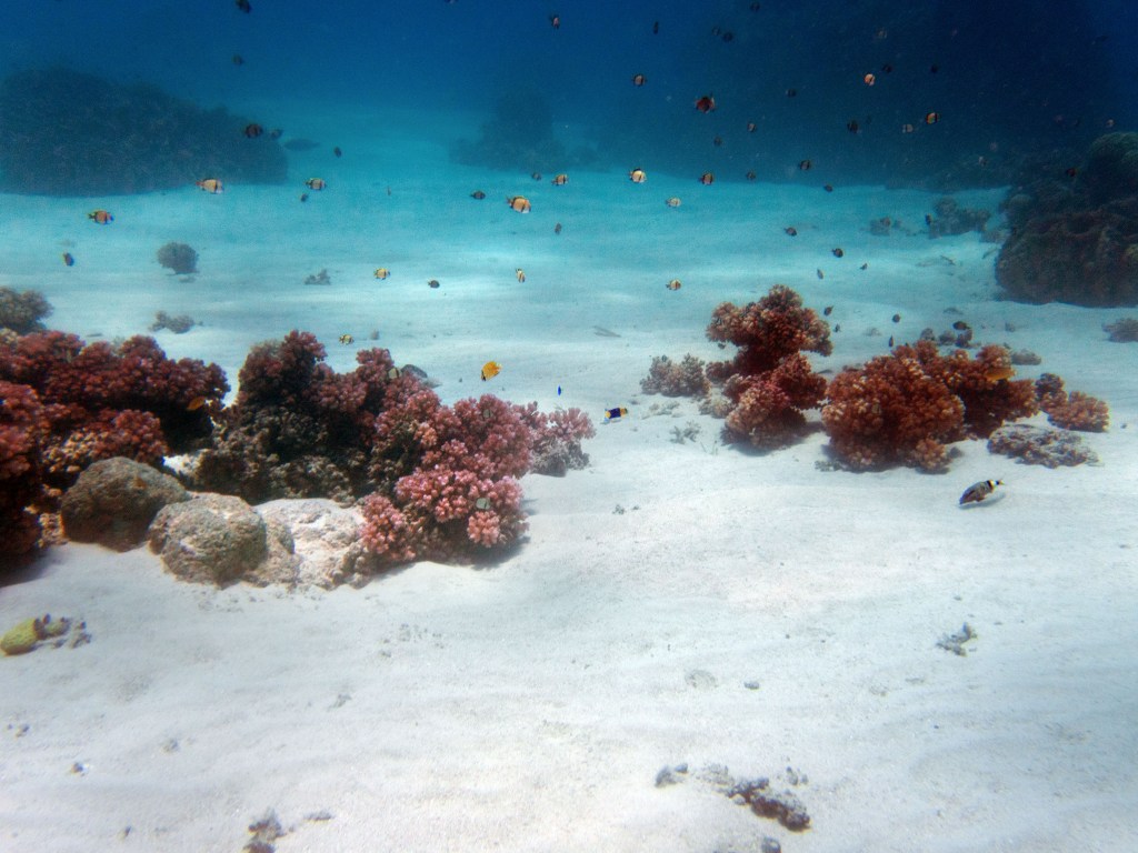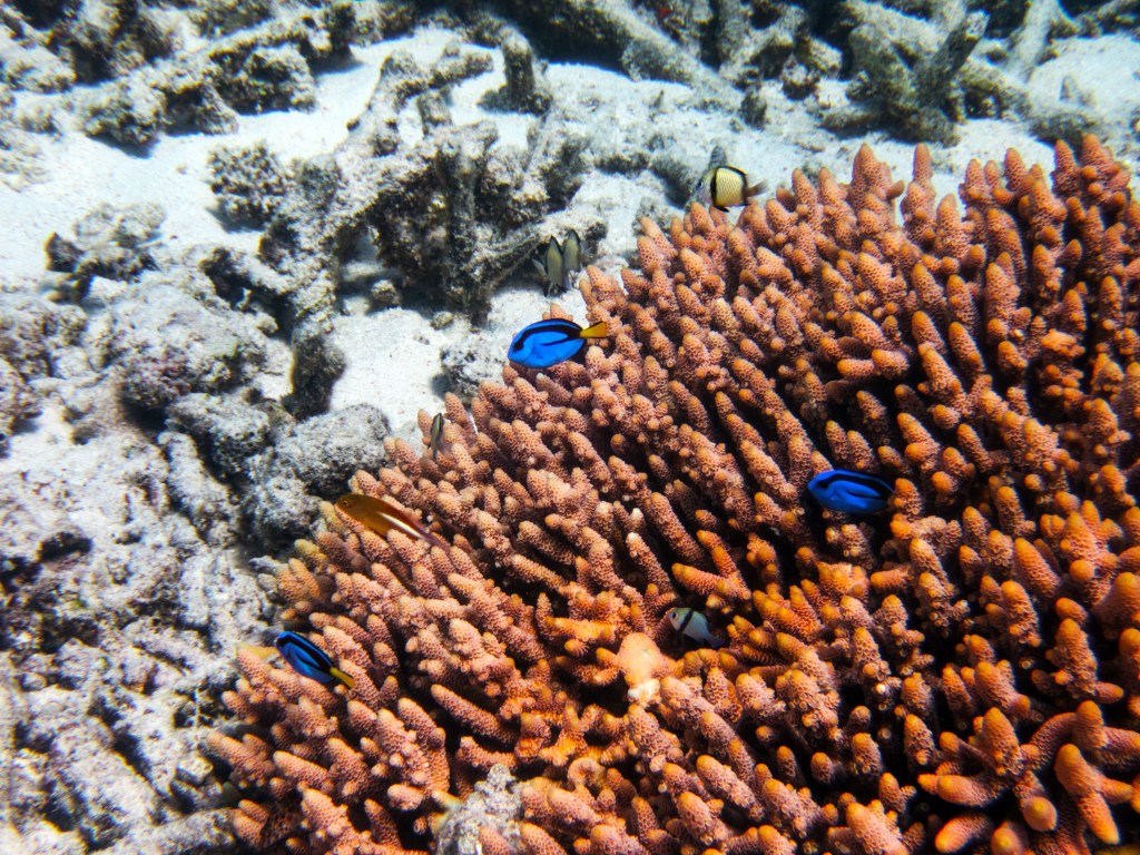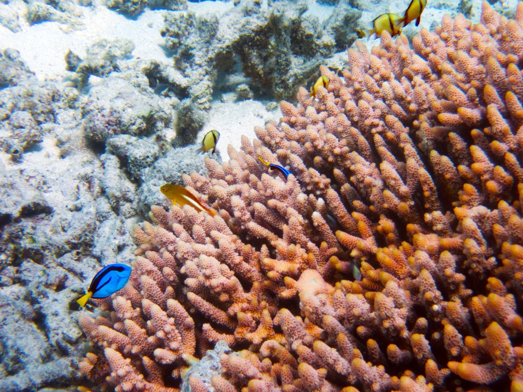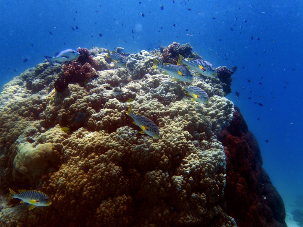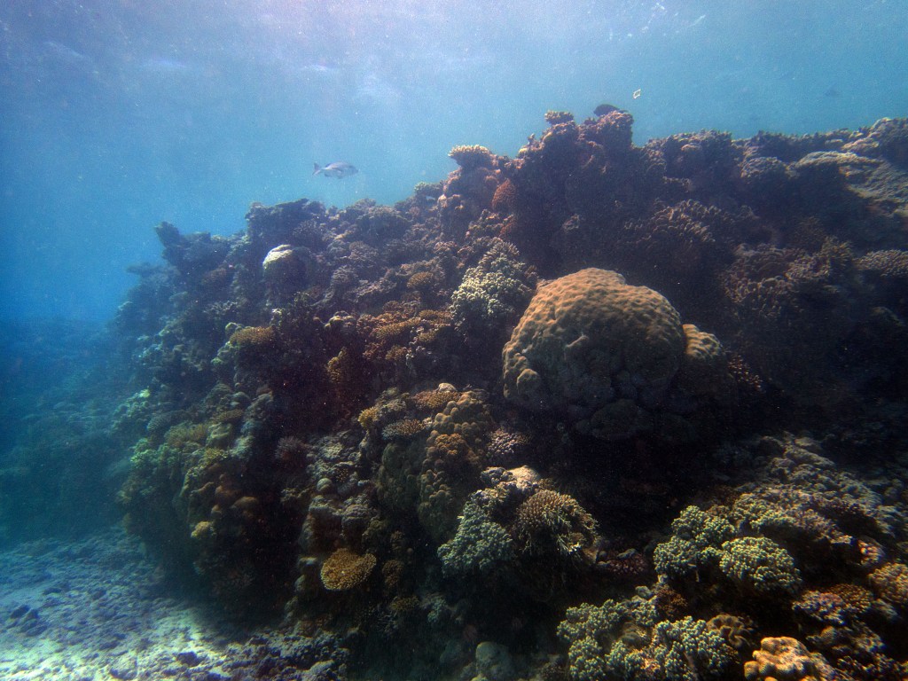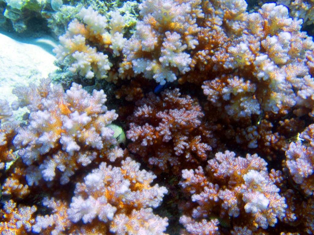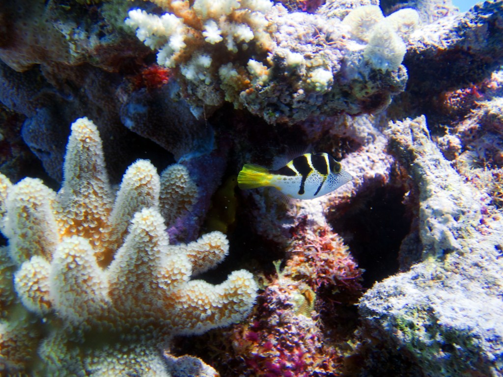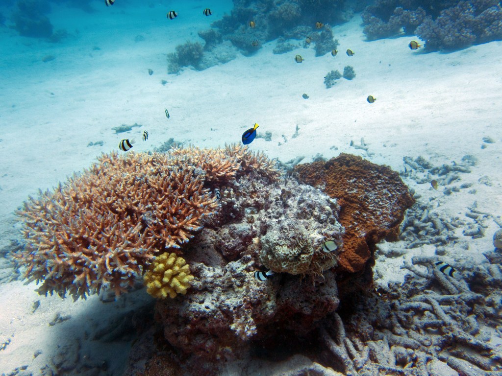 Deux seiches se reposent paisiblement vers un groupe de coraux. J’en profite pour donner l’appareil photo à notre guide afin qu’il nous prenne en photo. Nous apercevons également nos premiers Dory !!! Plus petit que ce que l’on pouvait penser, mais ceux-ci peuvent tout de même atteindre 30cm. Malheureusement pas de tortue cette fois-ci.