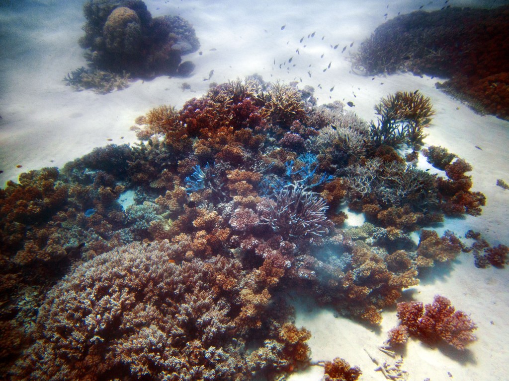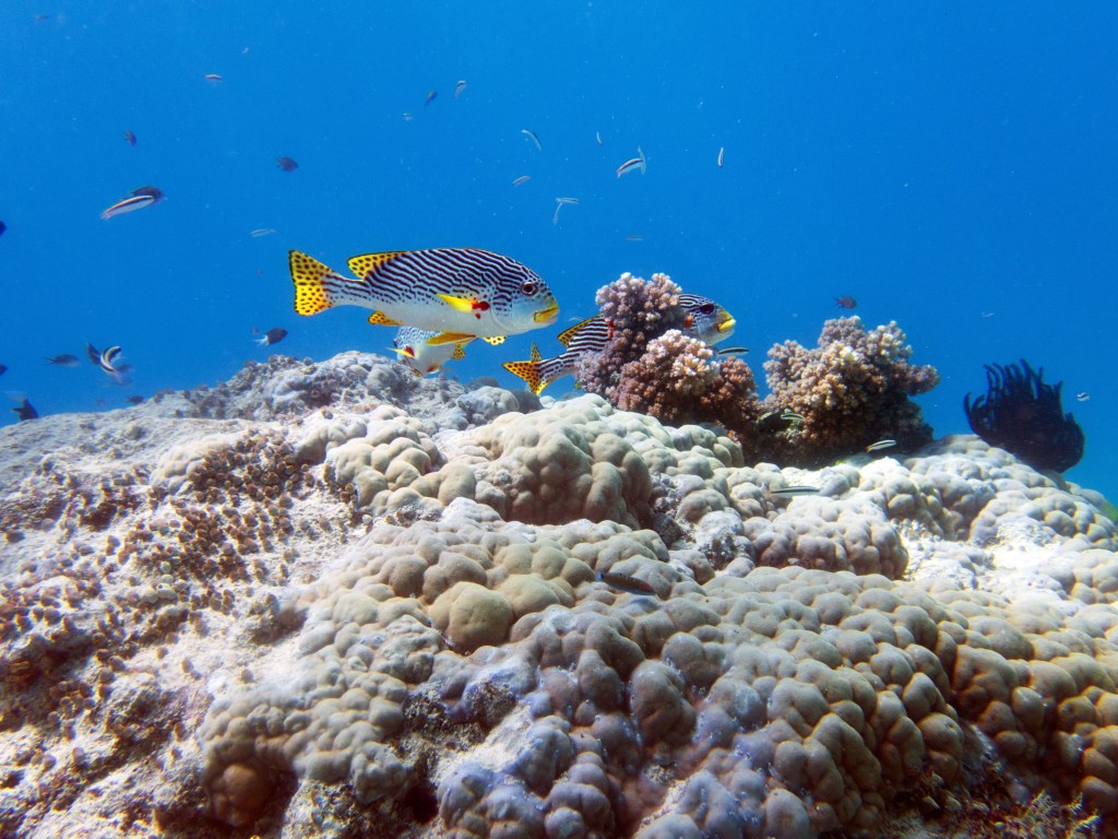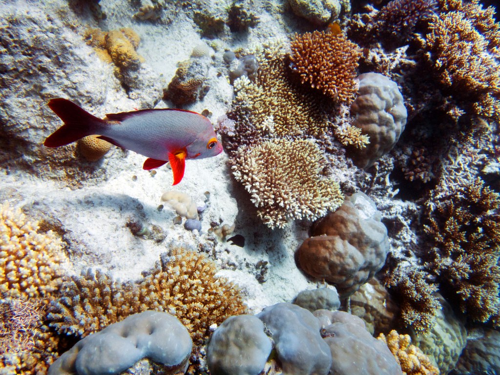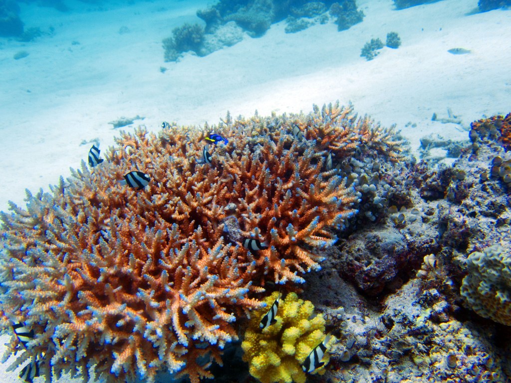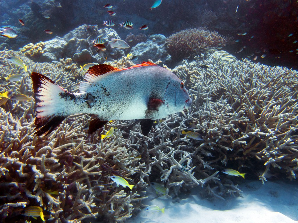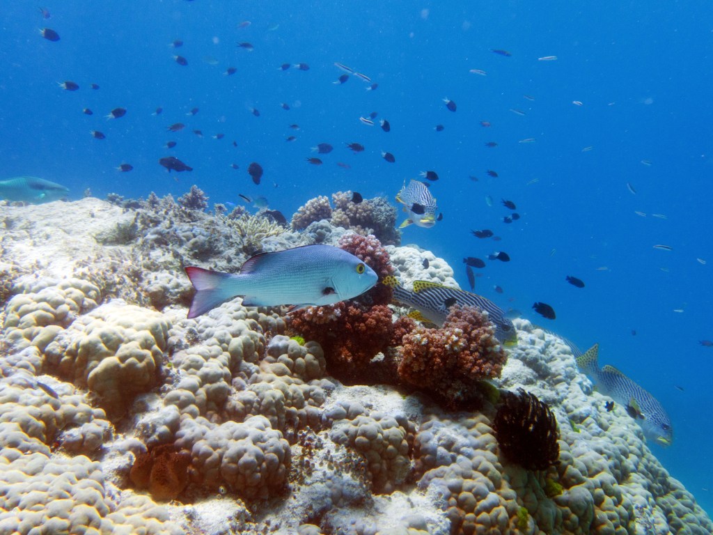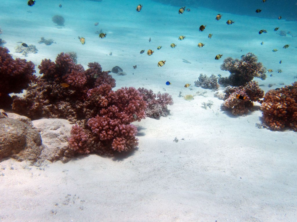 Deux seiches se reposent paisiblement vers un groupe de coraux. J’en profite pour donner l’appareil photo à notre guide afin qu’il nous prenne en photo. Nous apercevons également nos premiers Dory !!! Plus petit que ce que l’on pouvait penser, mais ceux-ci peuvent tout de même atteindre 30cm. Malheureusement pas de tortue cette fois-ci.