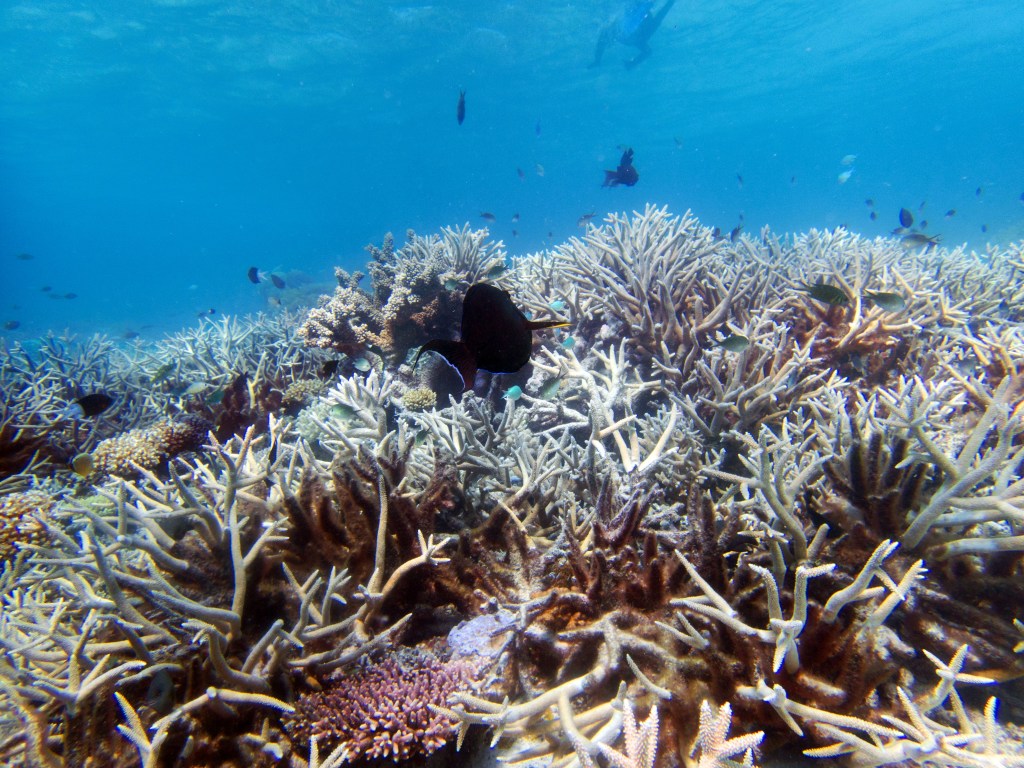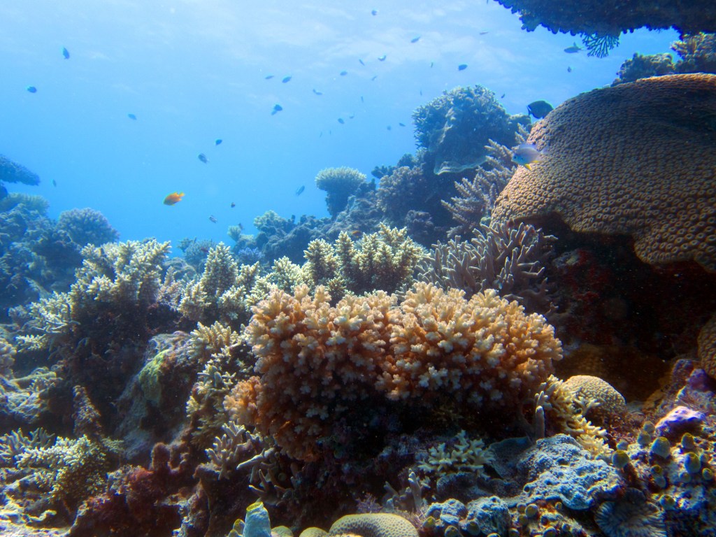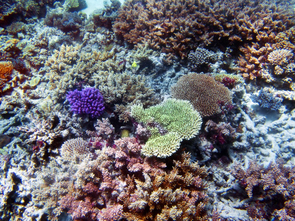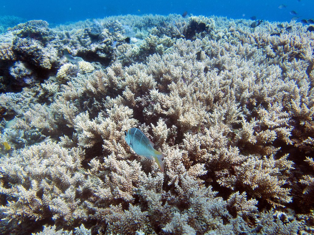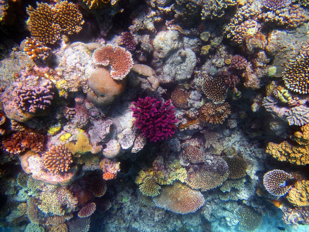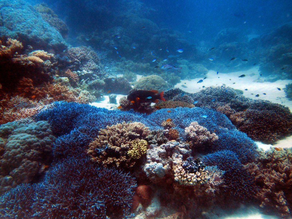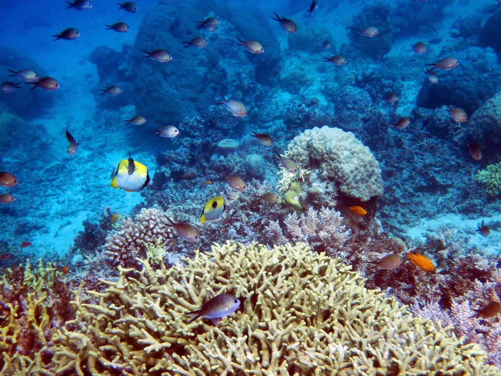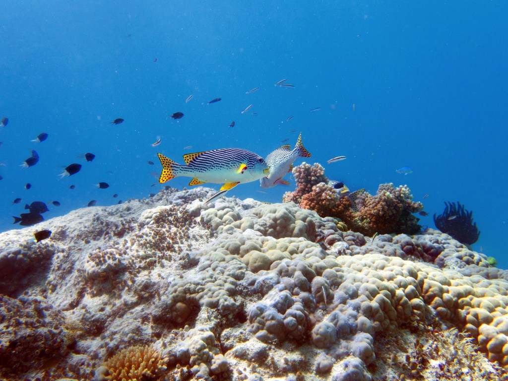 Deux seiches se reposent paisiblement vers un groupe de coraux. J’en profite pour donner l’appareil photo à notre guide afin qu’il nous prenne en photo. Nous apercevons également nos premiers Dory !!! Plus petit que ce que l’on pouvait penser, mais ceux-ci peuvent tout de même atteindre 30cm. Malheureusement pas de tortue cette fois-ci.