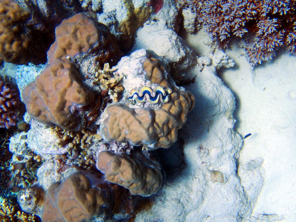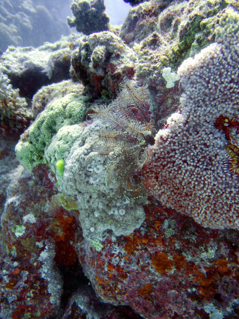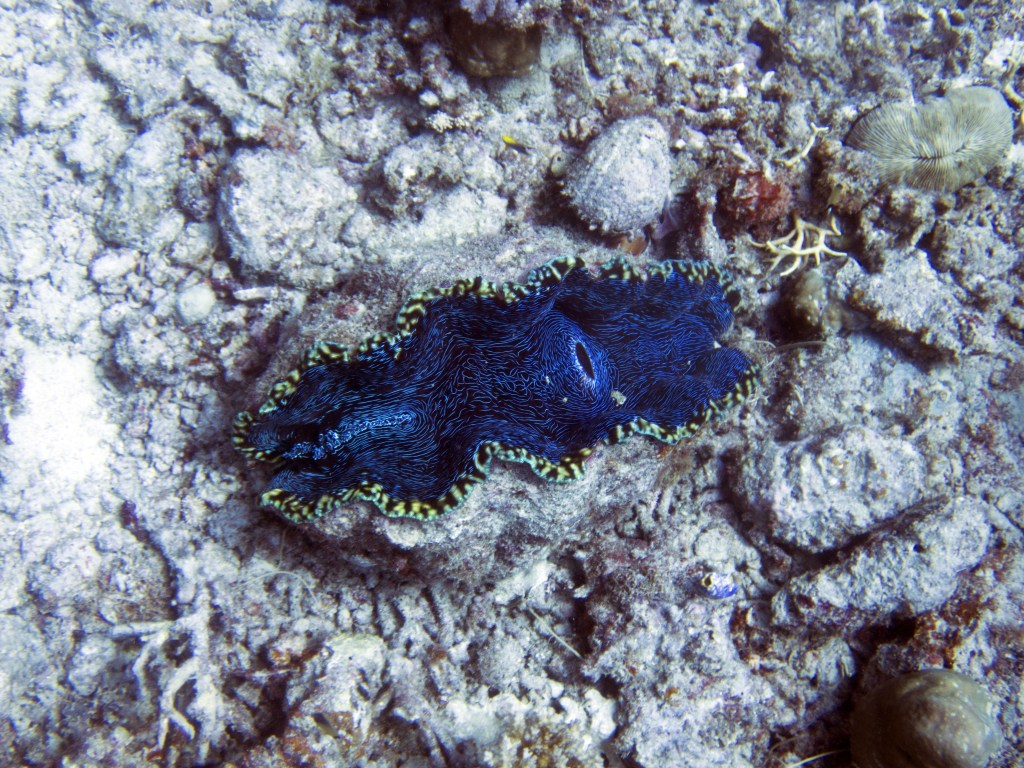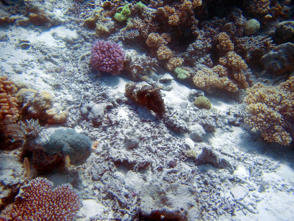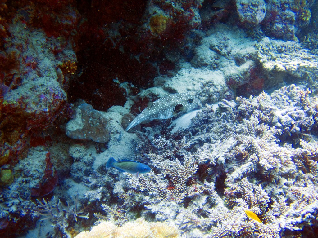 Turtle est le nom du deuxième emplacement où nous plongeons. Comme son nom l’indique nous espérons voir une tortue. A peine sous l’eau, notre guide prend un concombre de mer dans les mains. Comprenant qu’il veut nous le passer je m’éloigne un peu. Malheureusement Natacha se trouve juste à coté et fini par l’avoir dans les mains. Même à travers le masque j’ai pu voir son dégout. Nous continuons notre escapade, croisons quelques poissons clown bien cachés dans leurs anémones et une raie qui s’abrite sous un corail pour se protéger. Nous rencontrons également un poisson-baliste (Trigger Fish), qui possède d’impressionnantes dents. Il s’en sert pour briser les coquilles. Nous sommes à la bonne période de l’année donc rien à craindre de ce joli poisson. Lors de la saison des amours, il n’hésite pas à attaquer. Une de ses morsures peut nécessiter plusieurs points de suture.