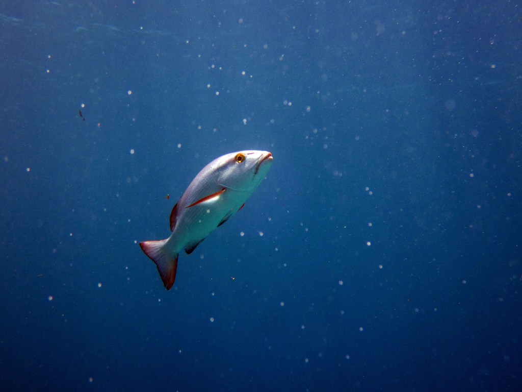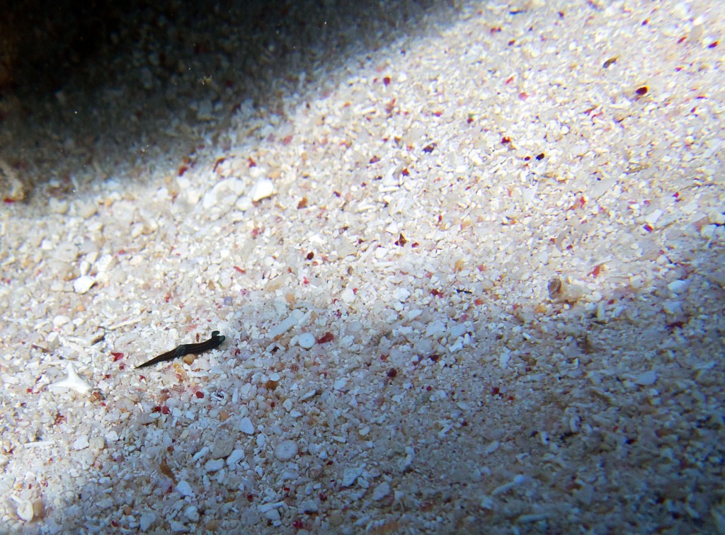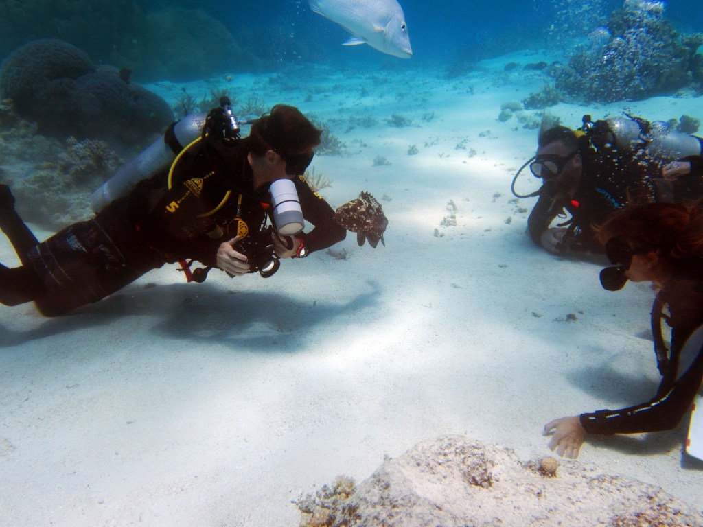 Nous reprenons notre balade et Natacha prend la pose avec des poissons clowns qui ont élu domicile dans une pierre d’encrage fendue. Plus tard nous croisons de nouveau une seiche. Celle-ci n’a vraiment pas peur et me laisse l’approcher. Nous nageons tranquillement le long d’un mur de corail quand nous apercevons un requin qui vient de se poser dans le sable. Ce n’est pas l’envie qui nous manque d’aller le rejoindre, mais vu qu’il s’agit de notre troisième plongée, nous n’osons plus aller si profond.