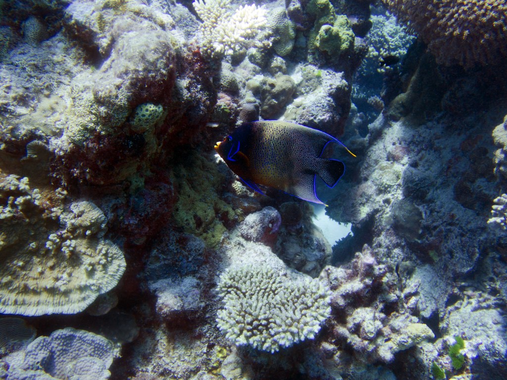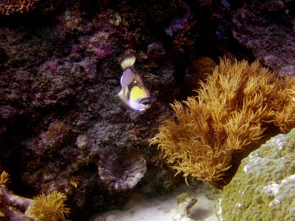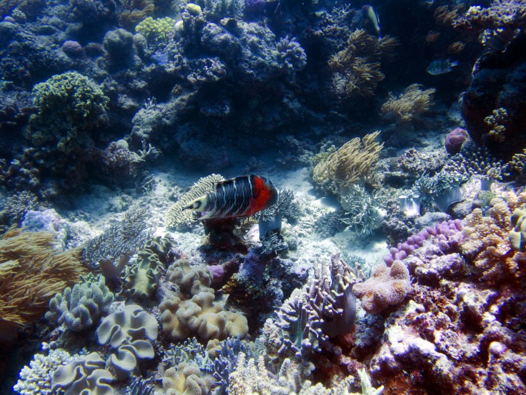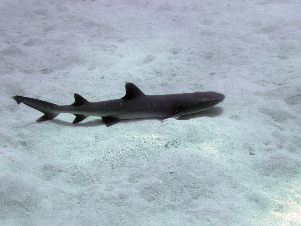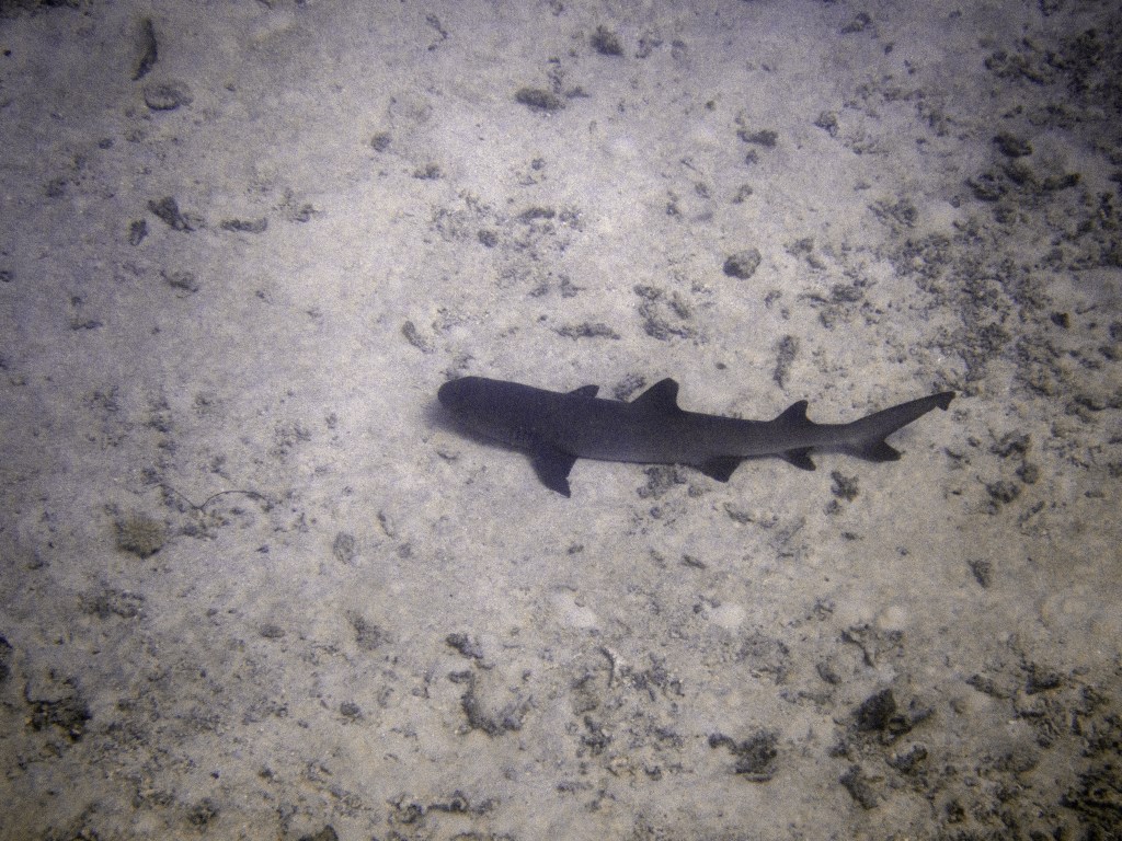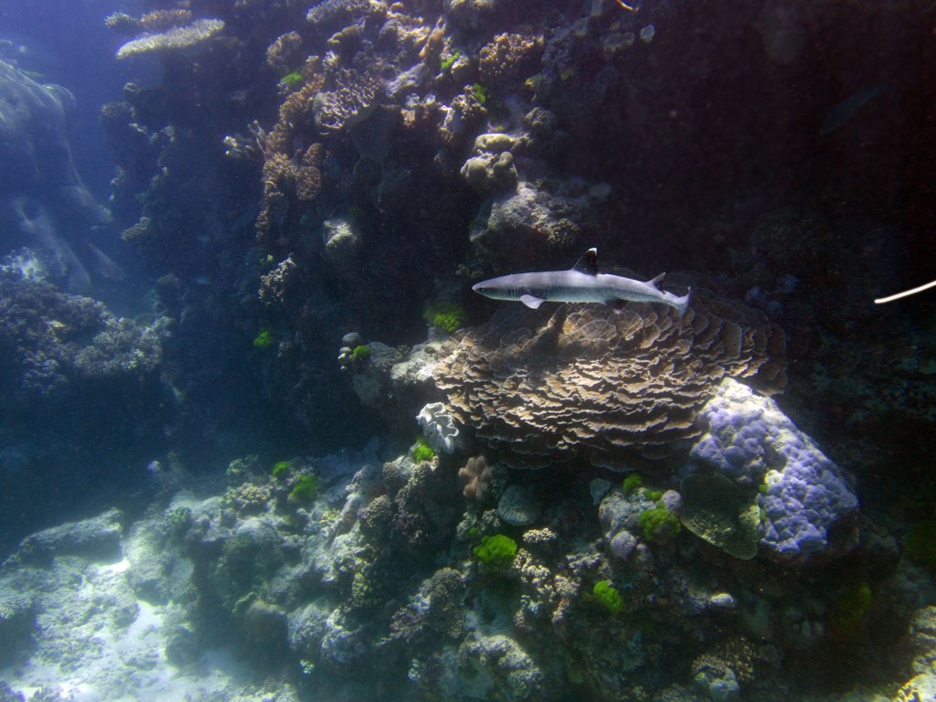 Je perds presque Yann sous l’eau alors qu’il poursuit un requin de récif à pointe blanche. A nouveau nous apercevons également pas mal de différents types de poissons, tels les poissons anges (Angel fish), Bat fish, Sting ray, Banner fish, Sweetlips et quelques triggerfish. Ces derniers sont assez sympathiques, mais lorsqu’un collègue de plongée nous raconte que ces poissons peuvent être très agressifs… nous sommes un peu plus sur nos gardes du coup quand nous les croisons. Ils possèdent en faite d’énormes incisives qui peuvent faire pas mal de dégâts.