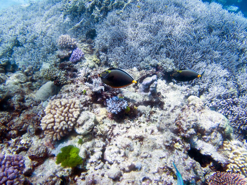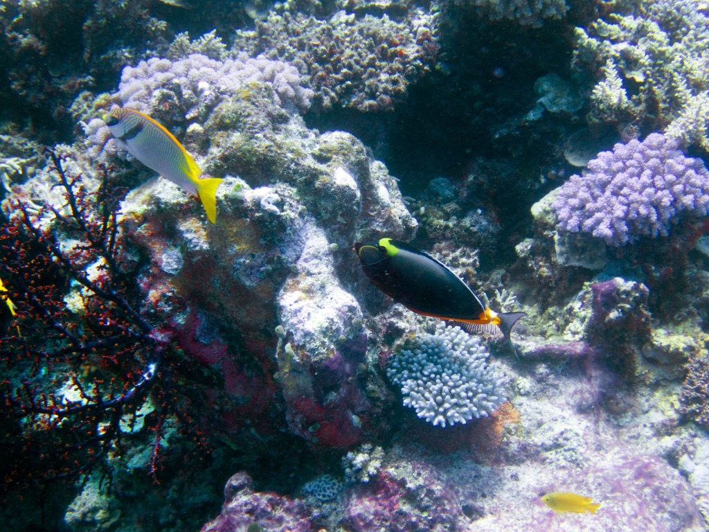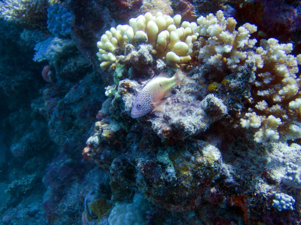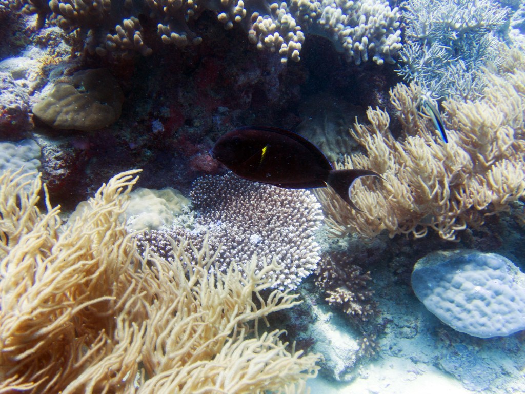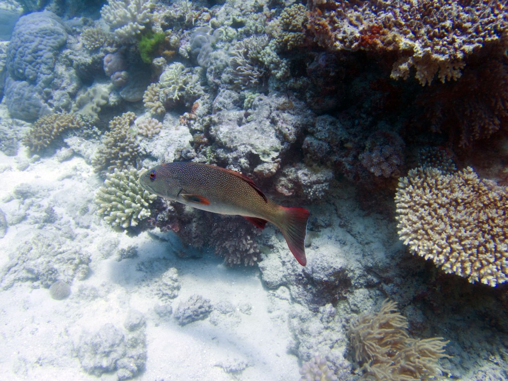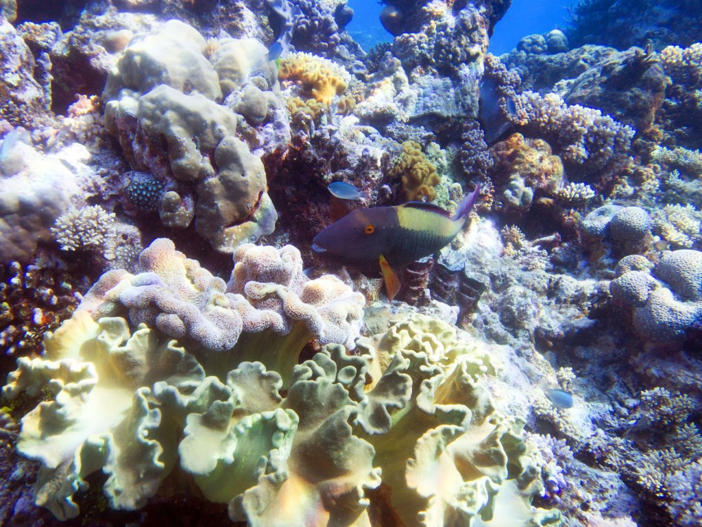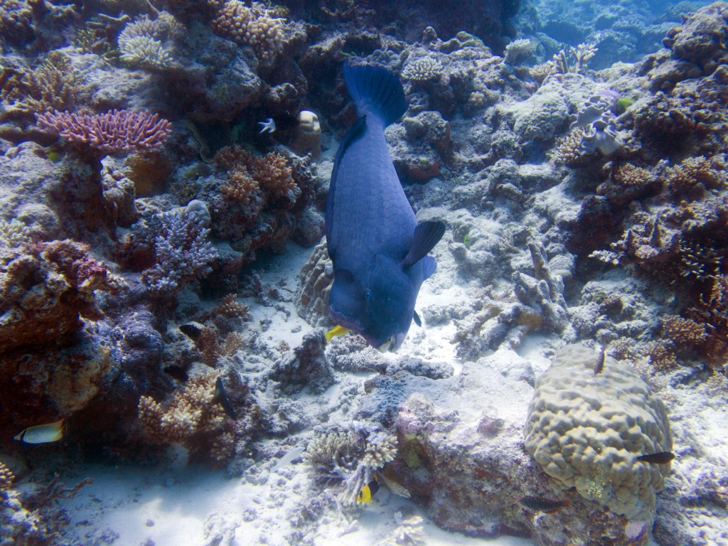 Je perds presque Yann sous l’eau alors qu’il poursuit un requin de récif à pointe blanche. A nouveau nous apercevons également pas mal de différents types de poissons, tels les poissons anges (Angel fish), Bat fish, Sting ray, Banner fish, Sweetlips et quelques triggerfish. Ces derniers sont assez sympathiques, mais lorsqu’un collègue de plongée nous raconte que ces poissons peuvent être très agressifs… nous sommes un peu plus sur nos gardes du coup quand nous les croisons. Ils possèdent en faite d’énormes incisives qui peuvent faire pas mal de dégâts.