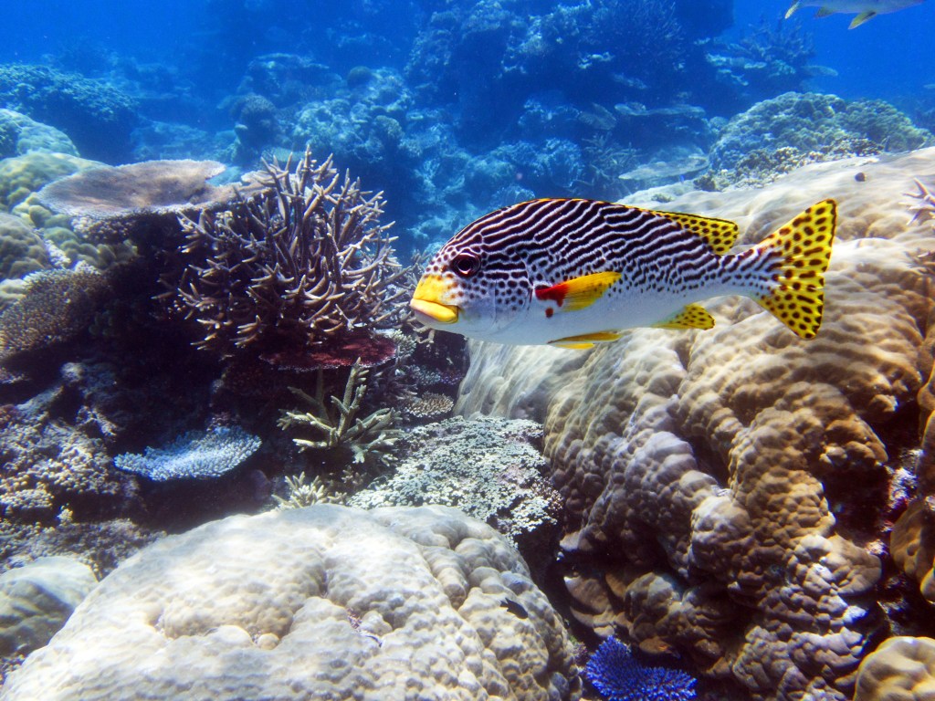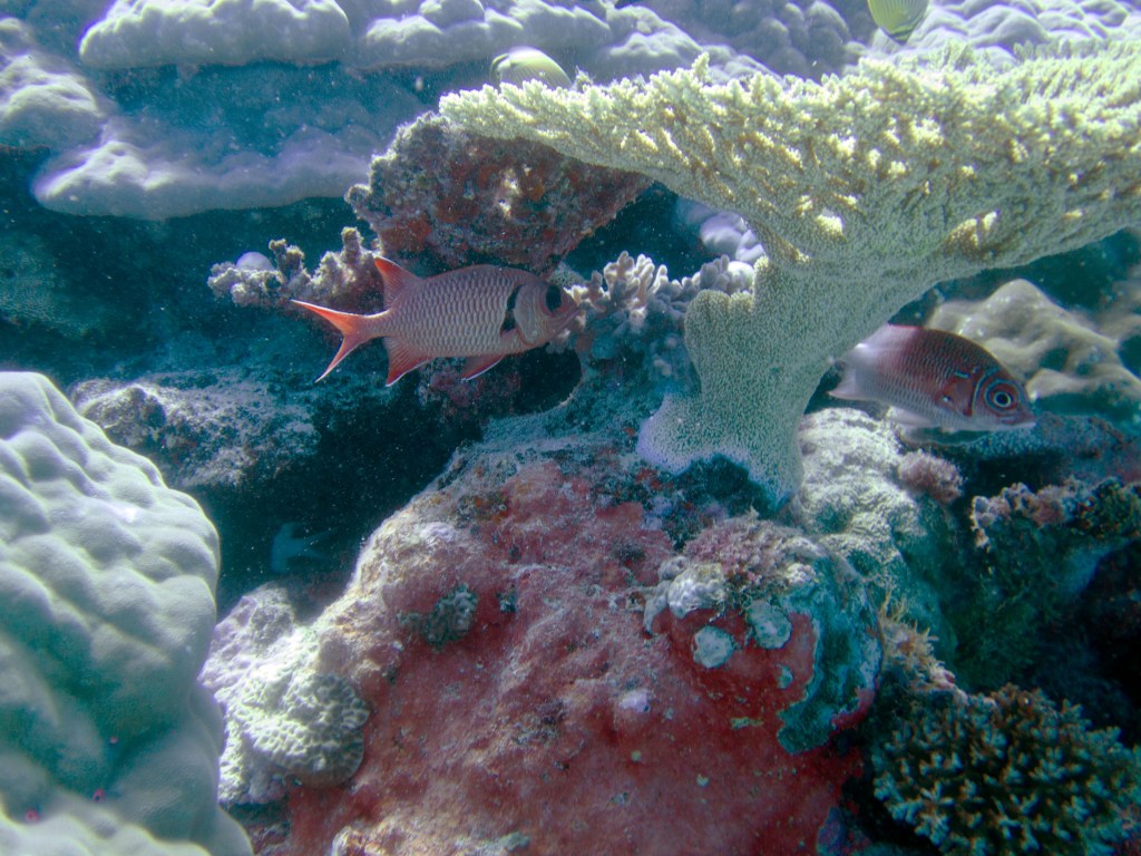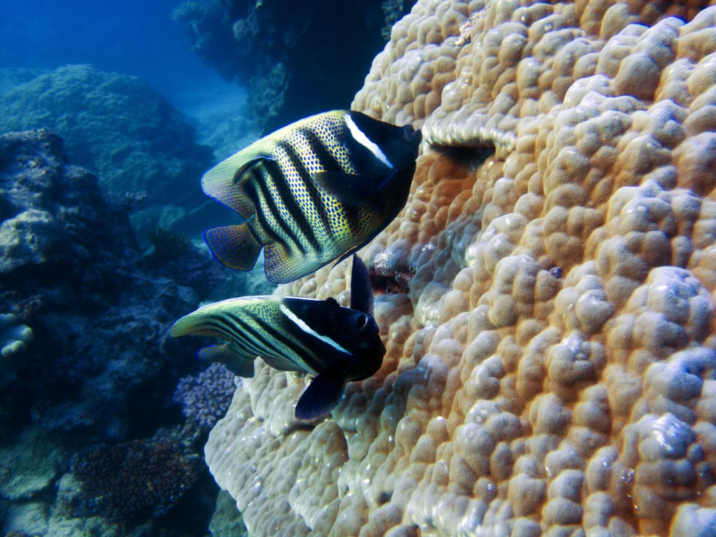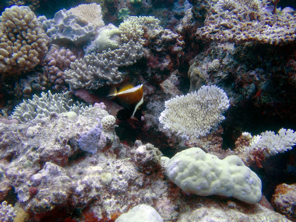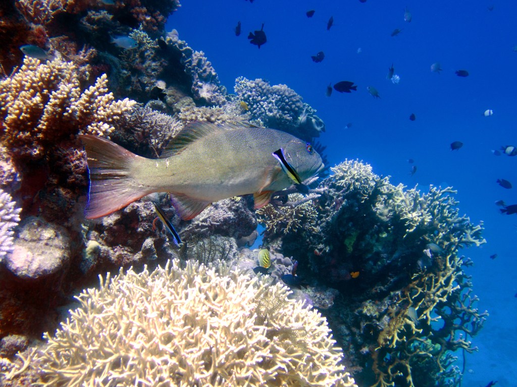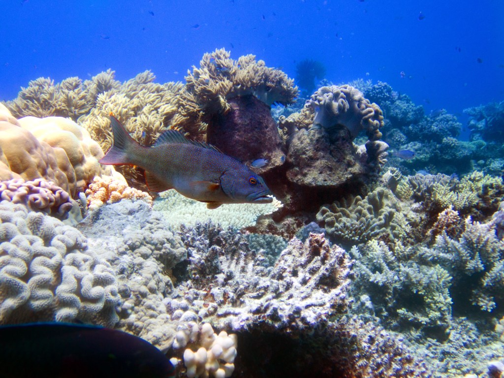 Je perds presque Yann sous l’eau alors qu’il poursuit un requin de récif à pointe blanche. A nouveau nous apercevons également pas mal de différents types de poissons, tels les poissons anges (Angel fish), Bat fish, Sting ray, Banner fish, Sweetlips et quelques triggerfish. Ces derniers sont assez sympathiques, mais lorsqu’un collègue de plongée nous raconte que ces poissons peuvent être très agressifs… nous sommes un peu plus sur nos gardes du coup quand nous les croisons. Ils possèdent en faite d’énormes incisives qui peuvent faire pas mal de dégâts.