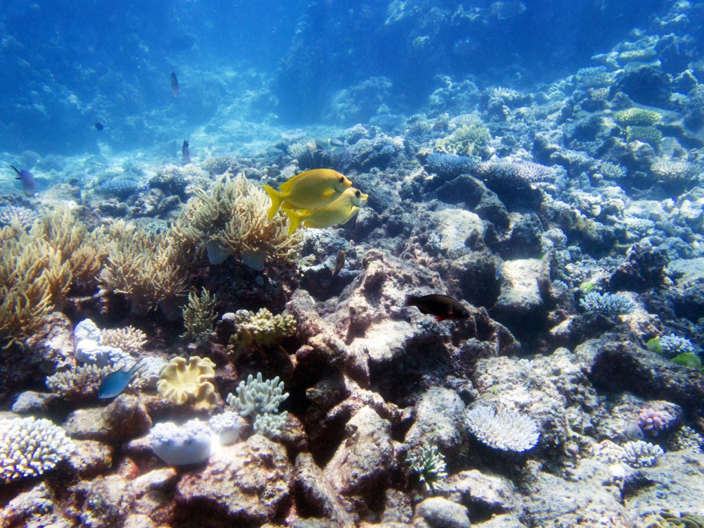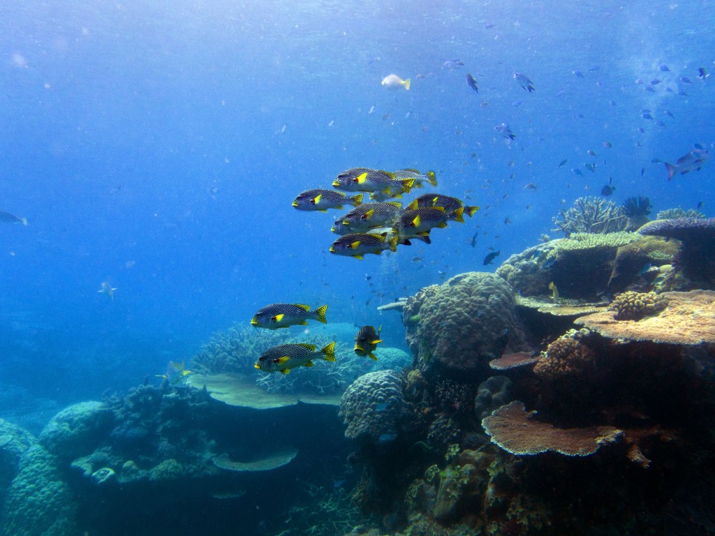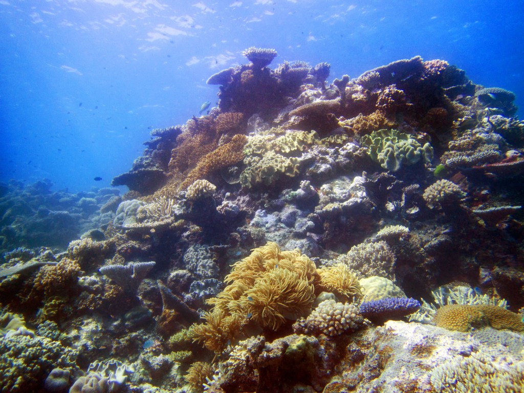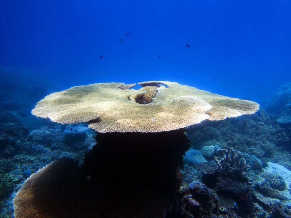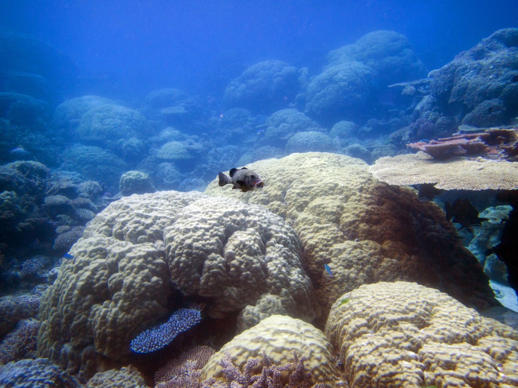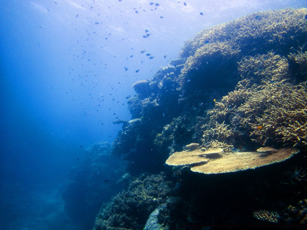 Pour notre première plongée, nous retournons au même endroit que la dernière fois qui se nomme Petaj sur le récif Milln. Depuis le bateau, l’eau semble être translucide. Nous n’avons qu’une hâte, c’est d’y aller. Briefing, préparation et une fois les derniers contrôles faits, hop à l’eau.