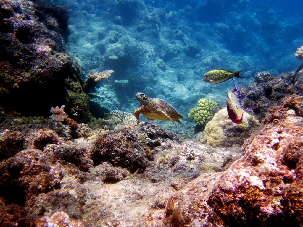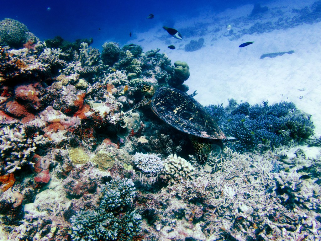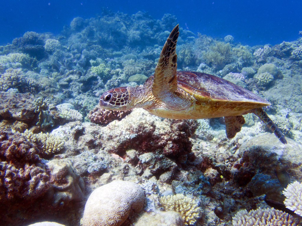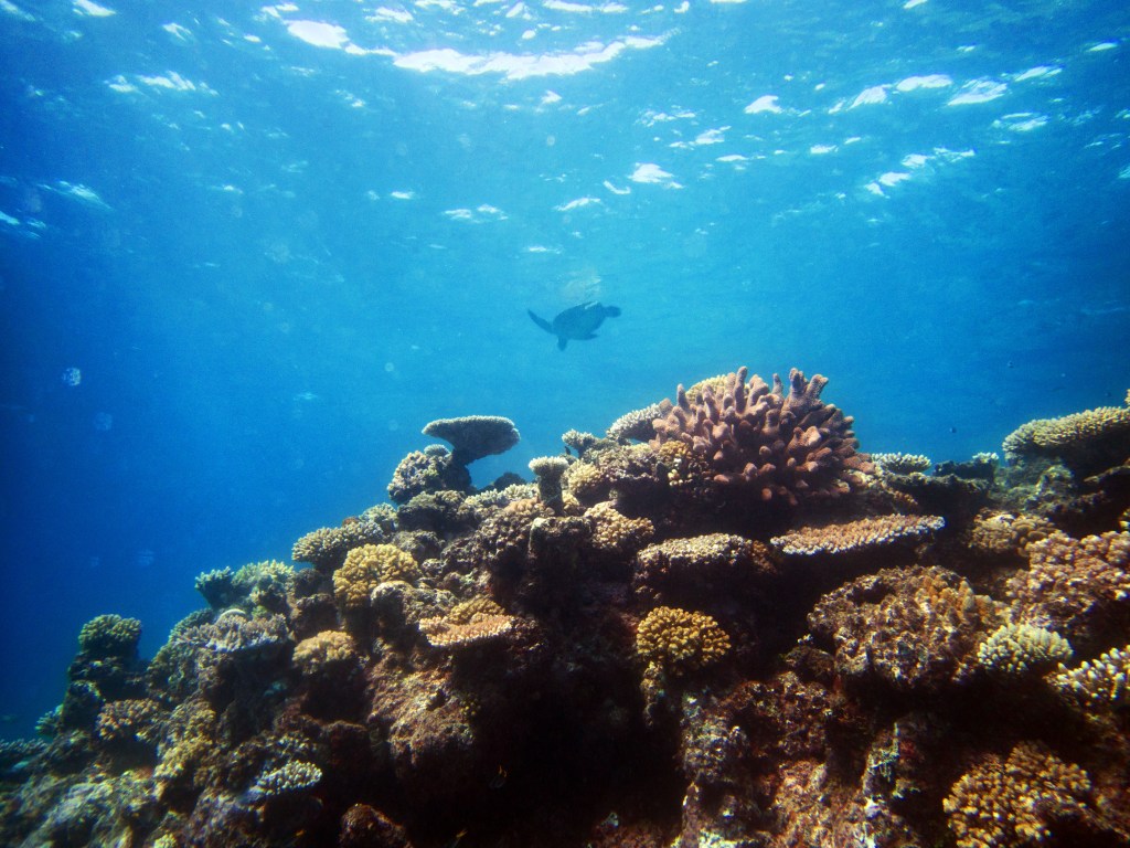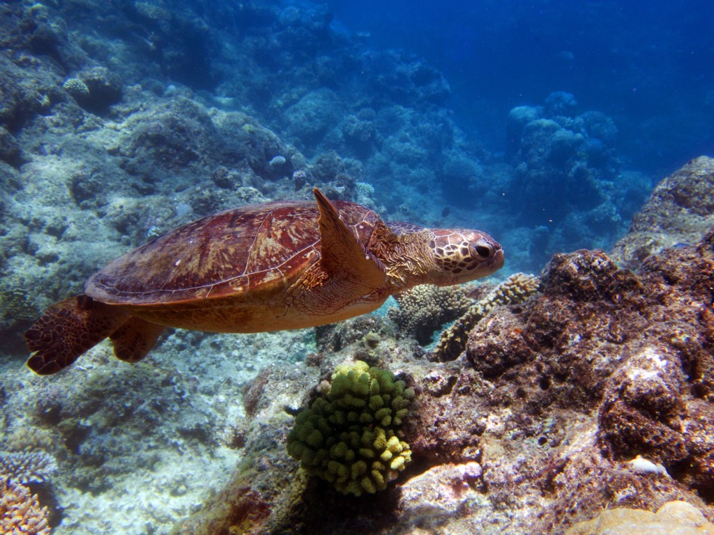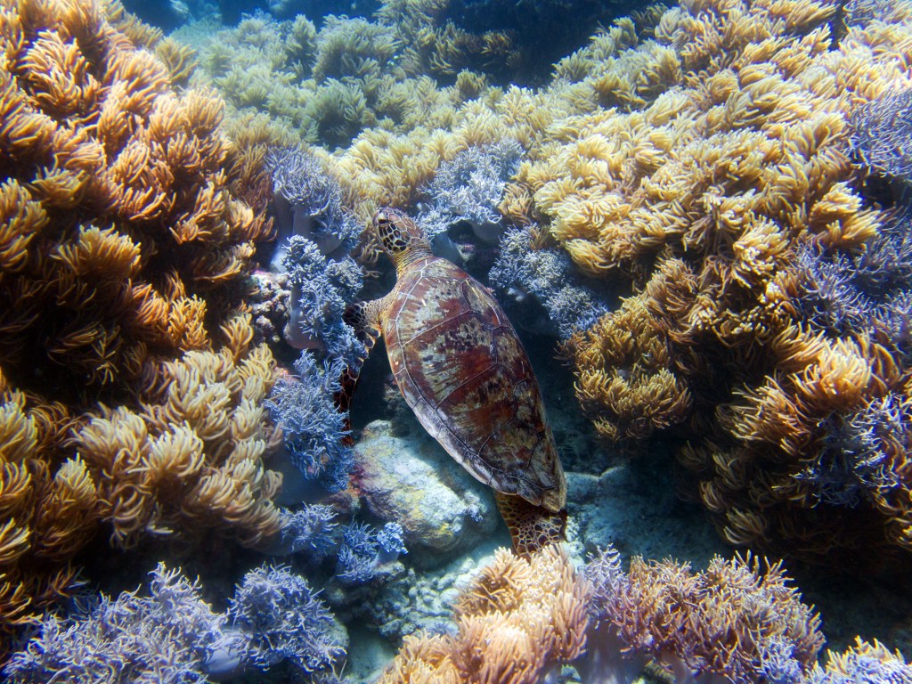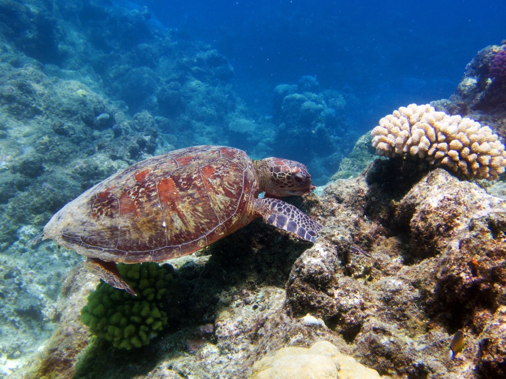 Avec environ 20 mètres, la visibilité est fantastique. Alors que nous nageons parmi les poissons, nous croisons une magnifique tortue qui remonte vers la surface pour prendre un bol d’air. On adore… nous restons un instant avec elle pour immortaliser le moment.