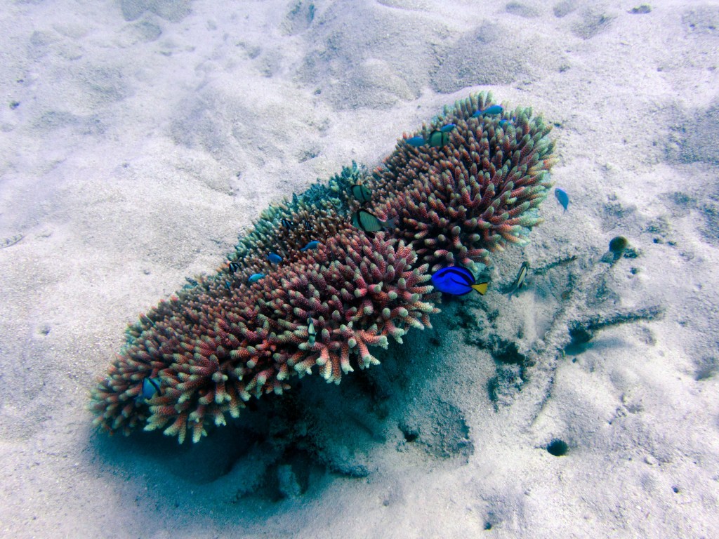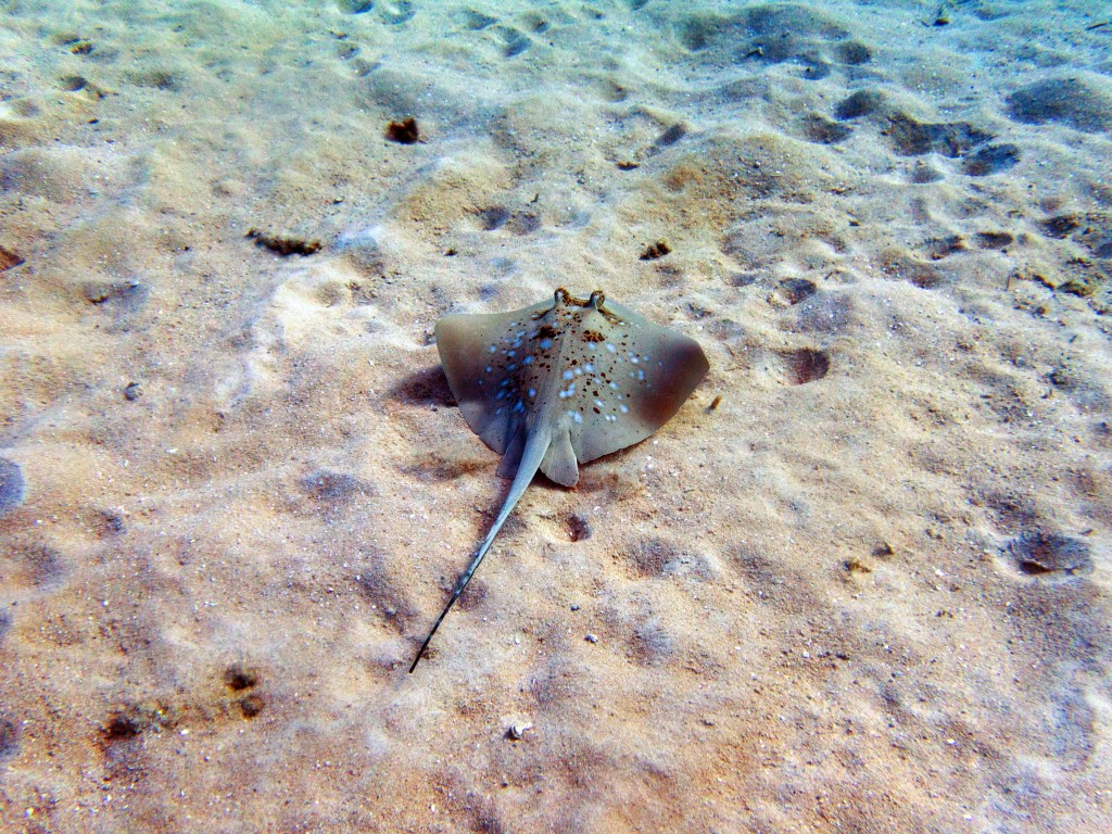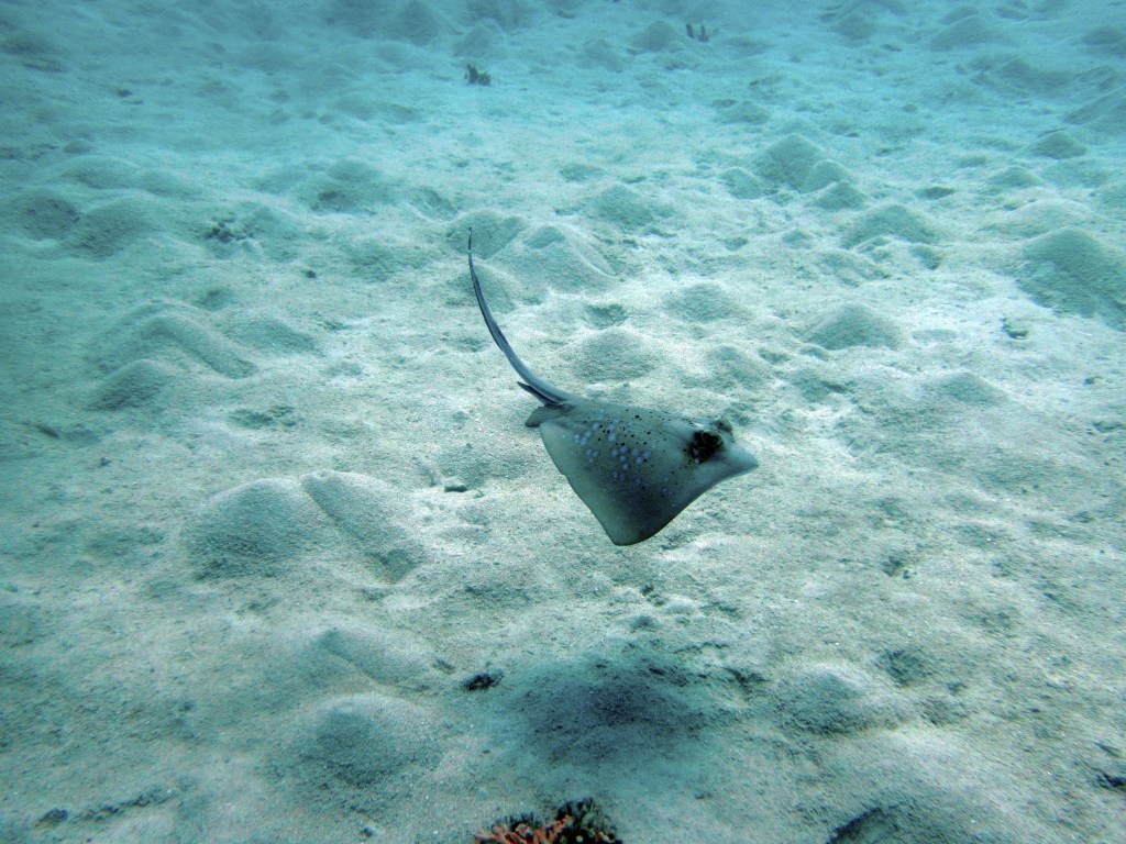 Nous restons au même spot pour la plongée suivante. Encore des tortues. On dirait qu’une d’entre elles a envie de nous suivre. Nous ne disons pas non, elle peut rester avec nous pour toujours si elle veut. Elle sont tellement gracieuses ! Nous croisons aussi un poisson chirurgien (Dory). Une petite raie se cache également dans le sable avant de s’enfuir en nous voyant débarquer. Tandis que nous faisons demi-tour pour retourner vers le bateau qui voyons nous ?! Notre ami la tortue 🙂 C’est comme si elle voulait nous montrer le chemin pour revenir au bateau. Elle nage à nos cotés pendant bien 2 minutes. Du coup nous profitons de sa présence pour prendre quelques photos et vidéos.
