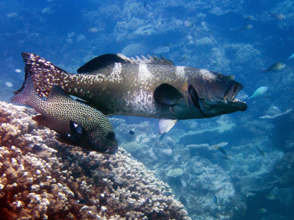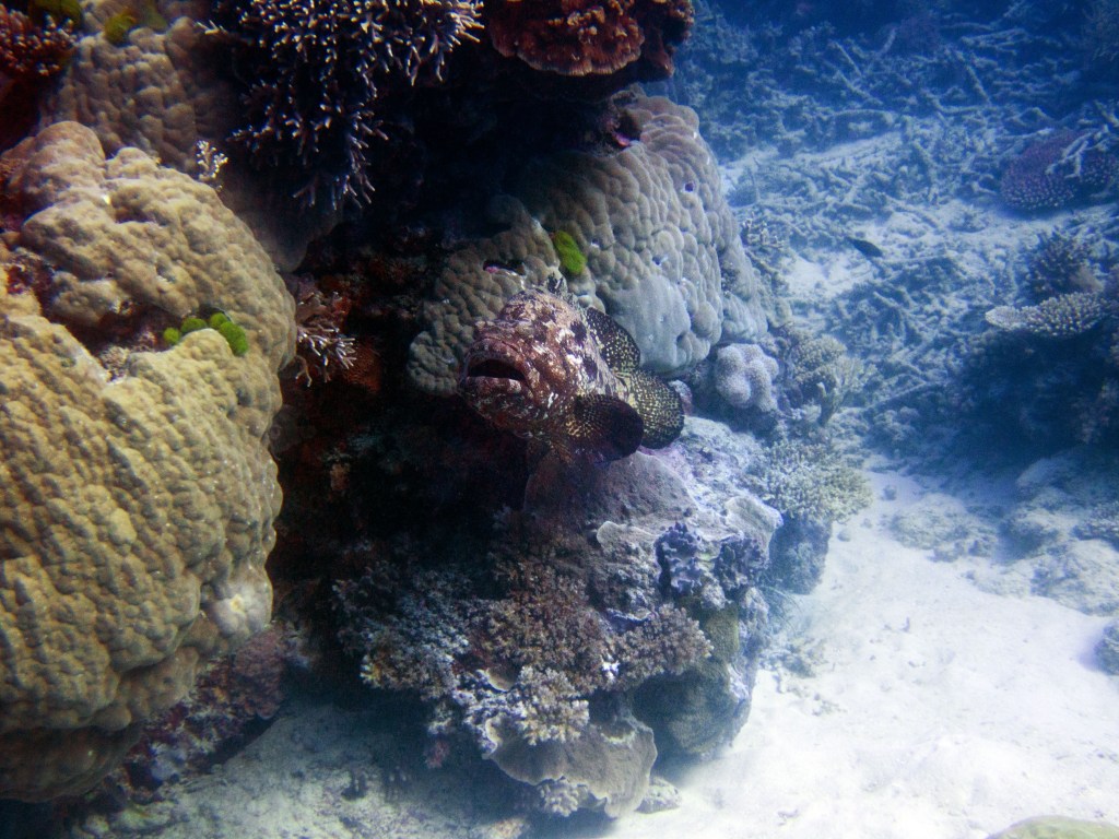 Nous nous déplaçons ensuite pour les 2 prochaines plongées à Swimming Pools toujours sur le récif de Milln. Une première fois pour repérer le coin et se faire une idée des environs. Nous croisons une raies, un triggerfish et quelques angelfish. Un mérou camouflage nous surprend. Ils sont relativement difficiles à repérer. Un autre mérou, qui est assez gros d’ailleurs se repose la bouche ouverte laissant entrevoir ses dents. Au milieu d’une anémone, nous pouvons voir deux petits poissons clown à collier.