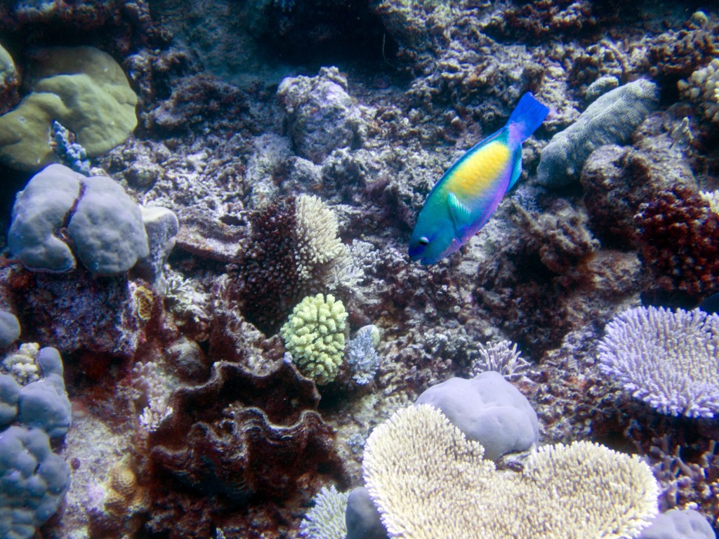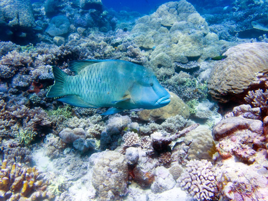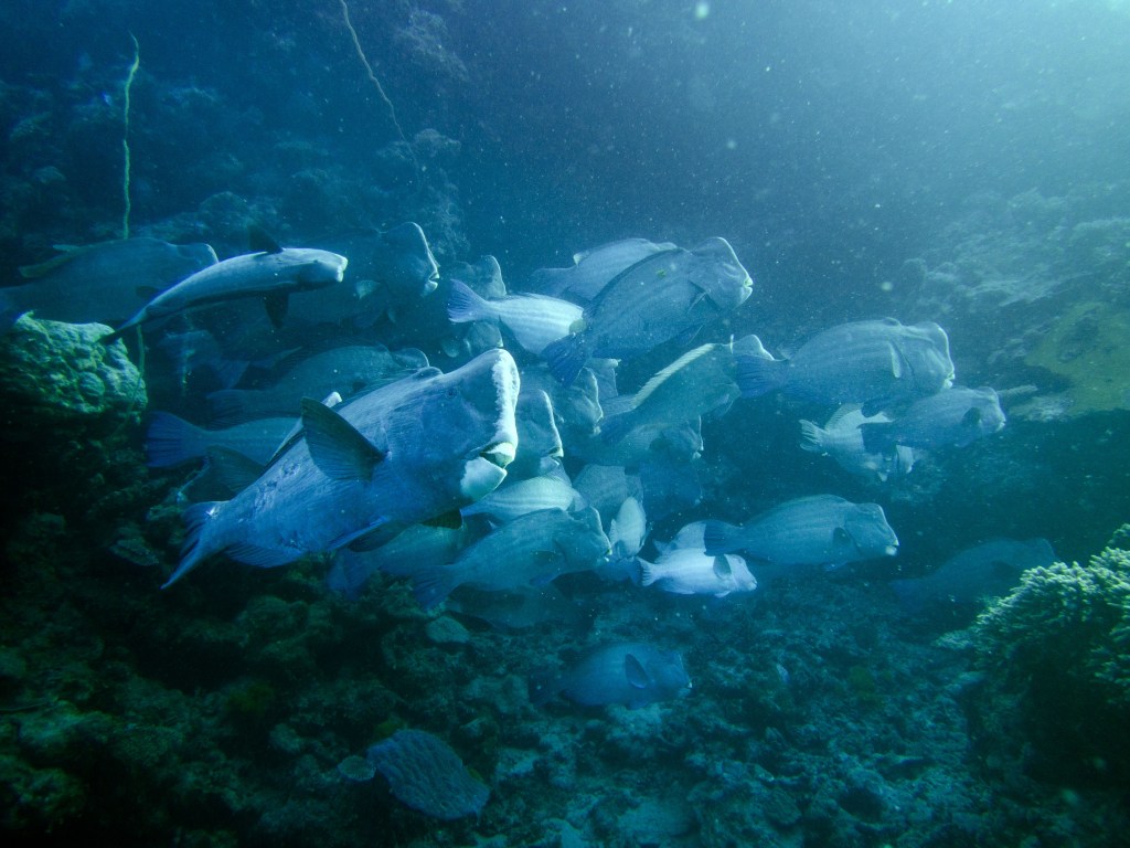 Dernier jour sur la Grande Barrière de Corail. Nous sautons dans l’eau à Little Tracy’s juste avant le petit-déjeuner. Alors que nous venons d’atteindre le fond, nous apercevons un lion fish le long d’un bommy. Génial 🙂 Quelques photos et nous continuons notre route. Arrivés vers un grand bommy, nous levons la tête et sommes époustouflés par le banc de Bumphead Parrotfish qui entourrent les coraux. Ils sont énormes et il y en a tellement ! C’est impressionnant ! Nous apercevons pour la première fois une autre espèce de triggerfish. Quelques raies sont aussi de la partie et une seiche.