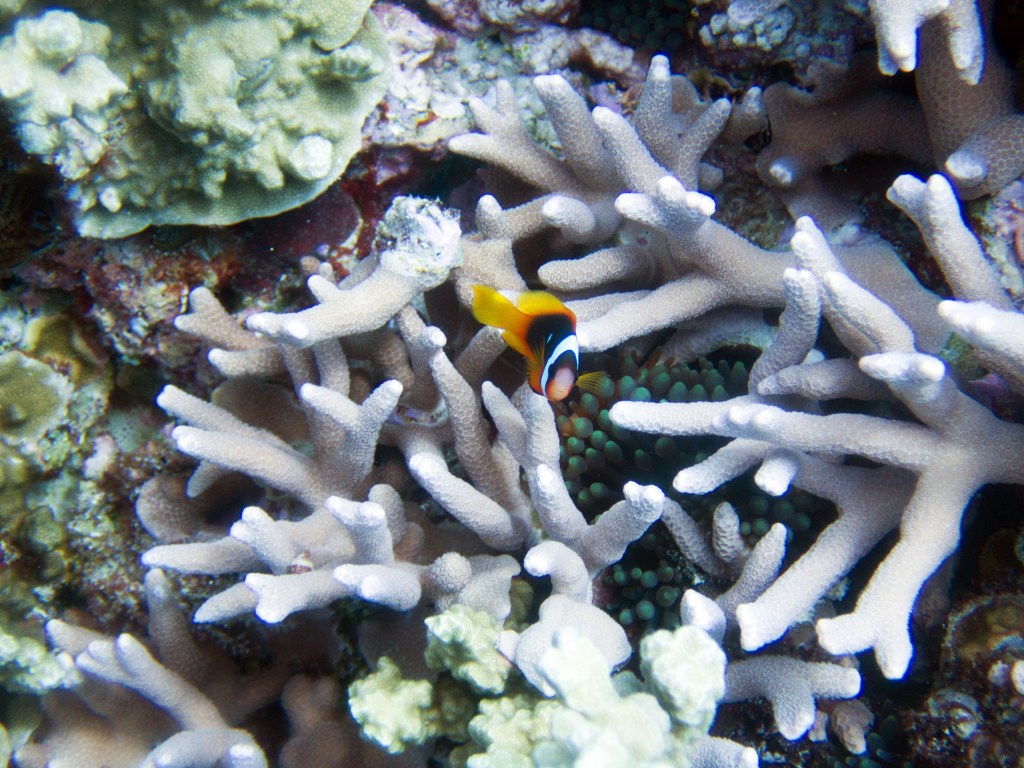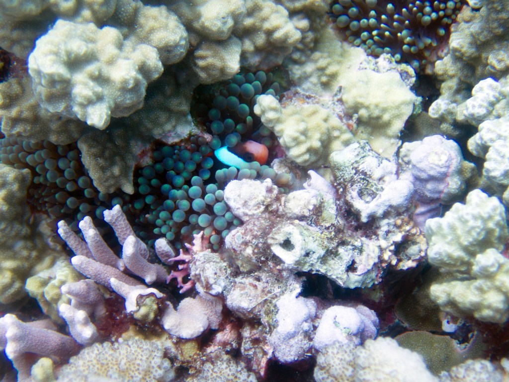 Un peu plus tard, nous voyons une autre tortue qui se repose sur les coraux. Notre aventure commence bien 🙂 Nous croisons également une petite famille de poisson clown dont un qui est vraiment minuscule. Ça nous fait toujours rire car ils ont toujours l’air de mauvaise humeur. Ils doivent en avoir marre de tous ces plongeurs qui s’arrêtent devant leur maison. Même pas un peu d’intimité.